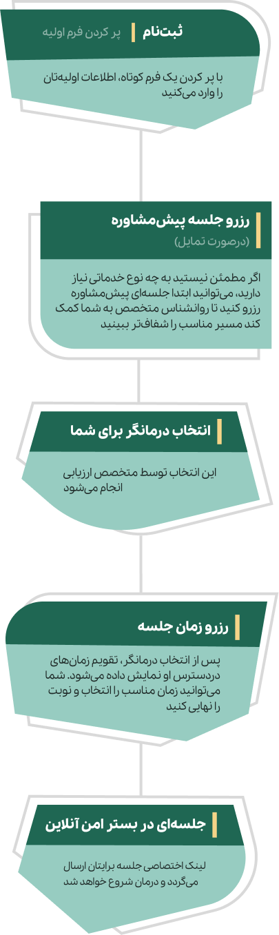 پس از ثبت و پرداخت جلسه اول (جلسه ارزیابی)، زمان گفتوگوی اولیه خود را با دکتر سهیلا خداوردیان سوپروایزر Barsa Wellbeing، از طریق پنل کاربری انتخاب میکنید. سپش چهار تست کلیدی روانشناسی در صفحه شخصی شما فعال میشود. توصیه میشود این تستها حداقل ۲۴ ساعت پیش از جلسه تکمیل شوند تا ارزیابی اولیه دقیقتر انجام شود و گفتوگویی هدفمند و اثربخش شکل بگیرد.
